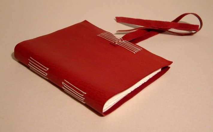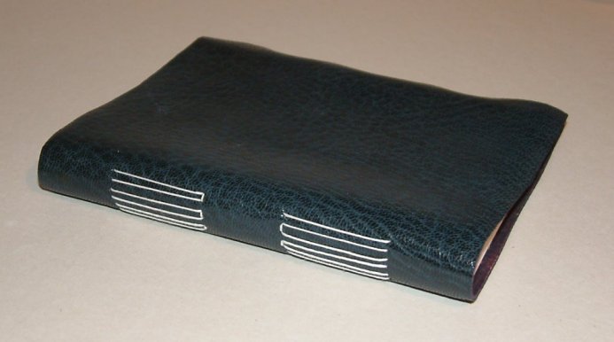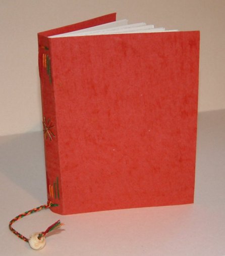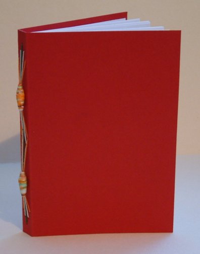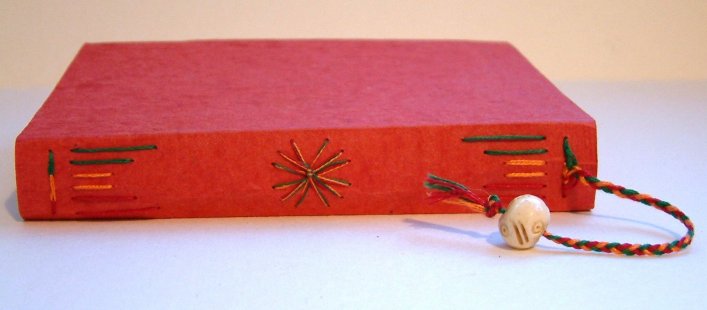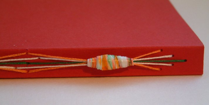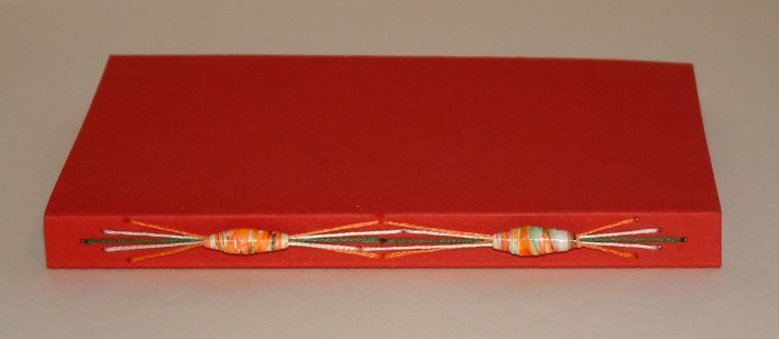A variation on the softbound single signature notebook. The 5 signatures are sewn through the spine as separate signatures, each one being tied off before sewing the next one. This lends itself to various decorative exposed stitch effects on the spine. Handmade beads are incorporated into this book.