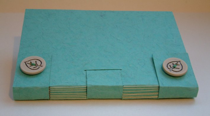 "Strap" Book - a crossed-structure-binding devised in Italy by Carmencho Arregui, a version of which is described in "the handmade book" by Angela James. This book has wooden buttons sewn on to the two front straps as a decorative feature.
