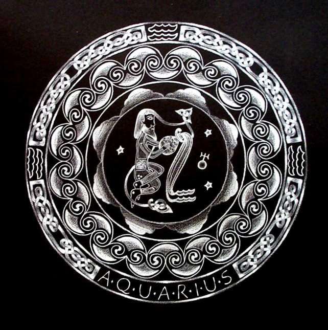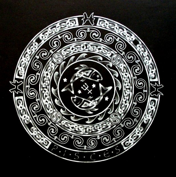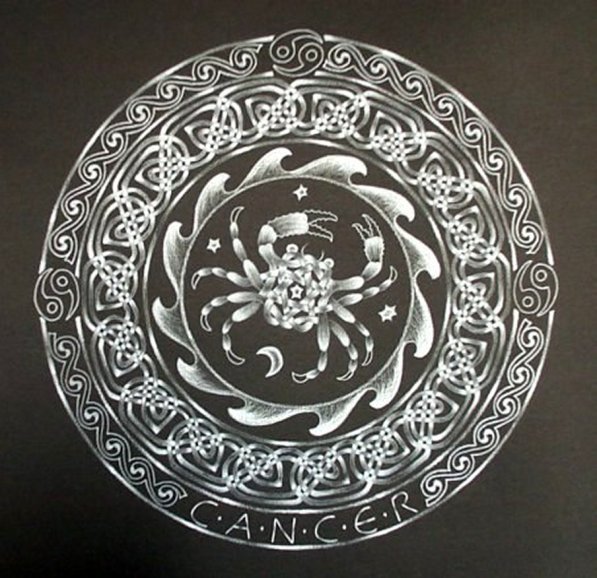 Three examples from a complete set of 12 mandalas based on the signs of the zodiac. They are made in white Karisma crayon on black Ingres paper.