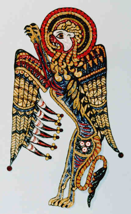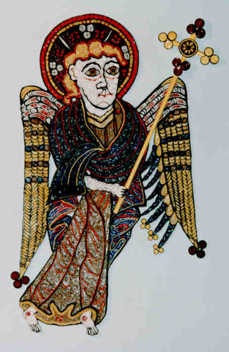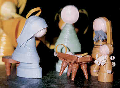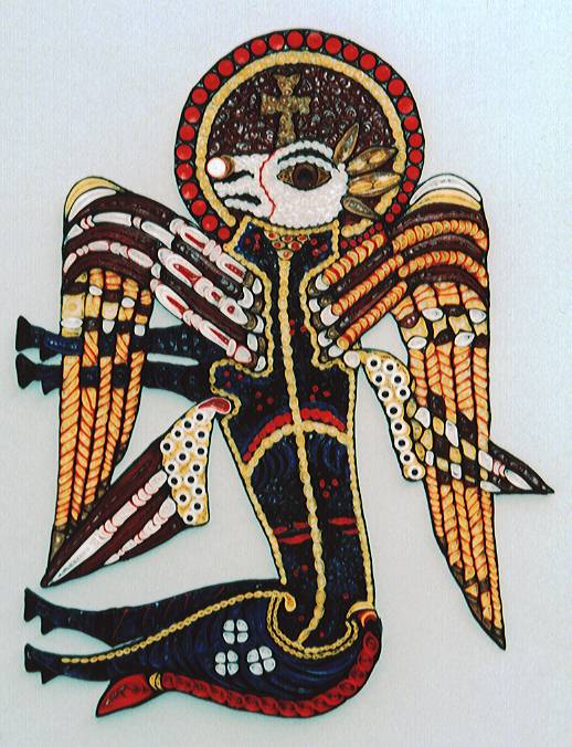 I quilled this Nativity set a few years ago from a design by my friend Jane Jenkins. The figures are made basically with tight coils. The angels' wings are alternate side looping. The set includes Mary, Joseph, Jesus in a manger, 3 wise men, 3 angels, a shepherd and a shepherd boy. I have yet to design and make the sheep!The four pictures in the second row are representations of the evangelists from the 'Book of Kells', an eighth century Irish gospel manuscript. They were awarded the Rose Bowl for the "most interesting quilling on display" at the second International Festival of Quilling held in Warwickshire in August 1997.