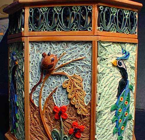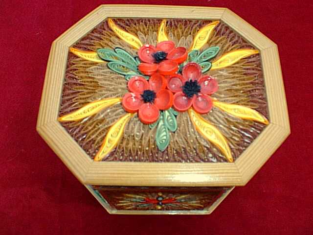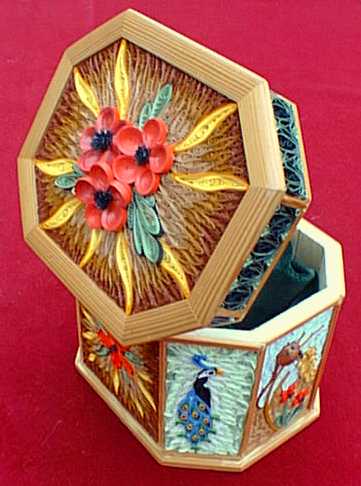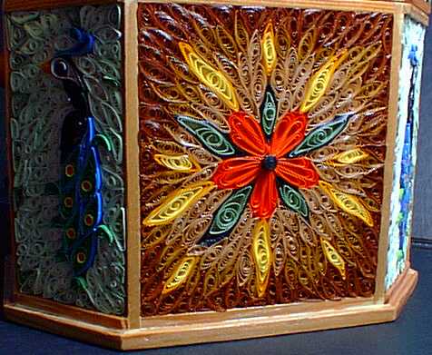 Also an row 4 is a full view of a 1998 project of mine. This wooden tea caddy was made locally for me to quill, by a friend of a work colleague, with the panels inset by 3mm to take the quilling strips. The quilled caddy won the "Quilled Box" section of the competition at the 1998 Quilling Guild AGM.