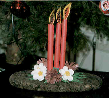 Another Christmas decoration - this is quilled on cork, and includes fir cones made from fringed strips, and Christmas roses made from tight coils. The candles are rolled from squares of paper with thin strips of paper spiralling round them.