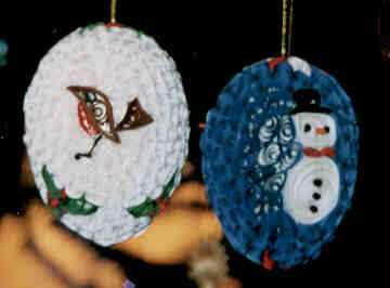 These Christmas tree decorations are quilled on blown hens' eggs.