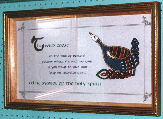 This framed calligraphy is decorated with a quilled goose - from the symbol of the Holy Spirit of the Iona Community (an island off the NW coast of Scotland.) I wish I had taken a better photograph before I gave this away! The goose logo is the copyright of the Iona Community - visit them at www.iona.org.uk. Also, you can visit their bookshop at the Wild Goose Publications' website.
